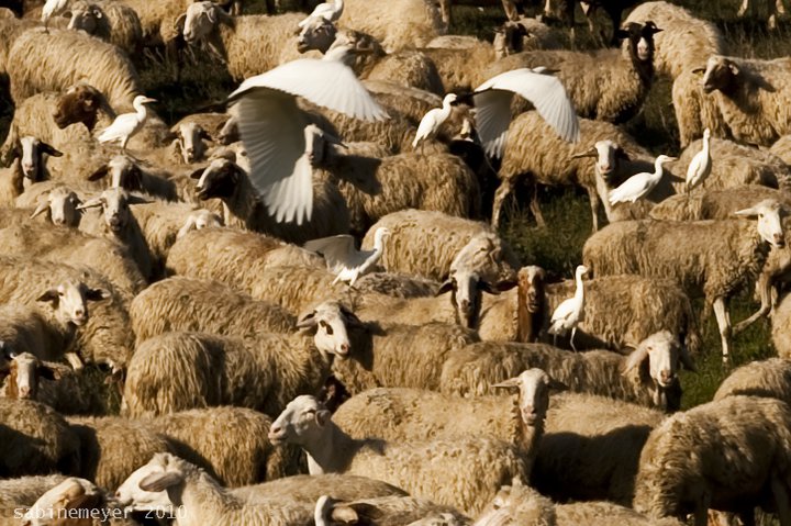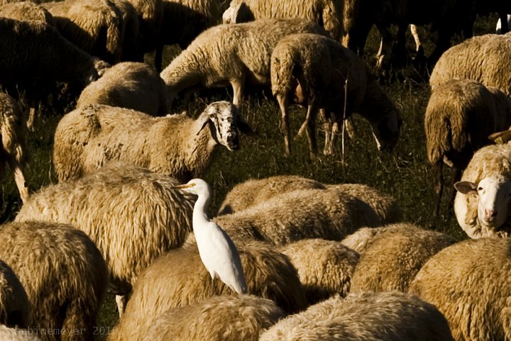 Dieci Aironi Guardabuoi che hanno preferito un gregge di Pecore ad una mandria di Bufali.